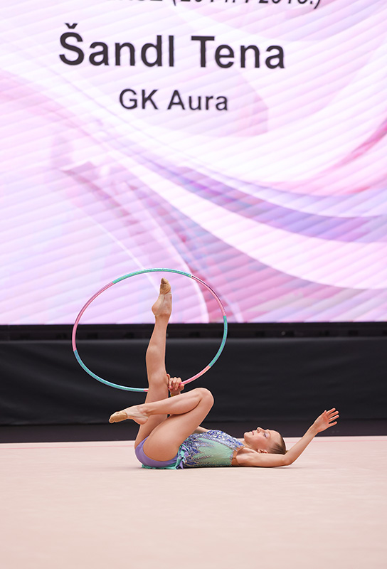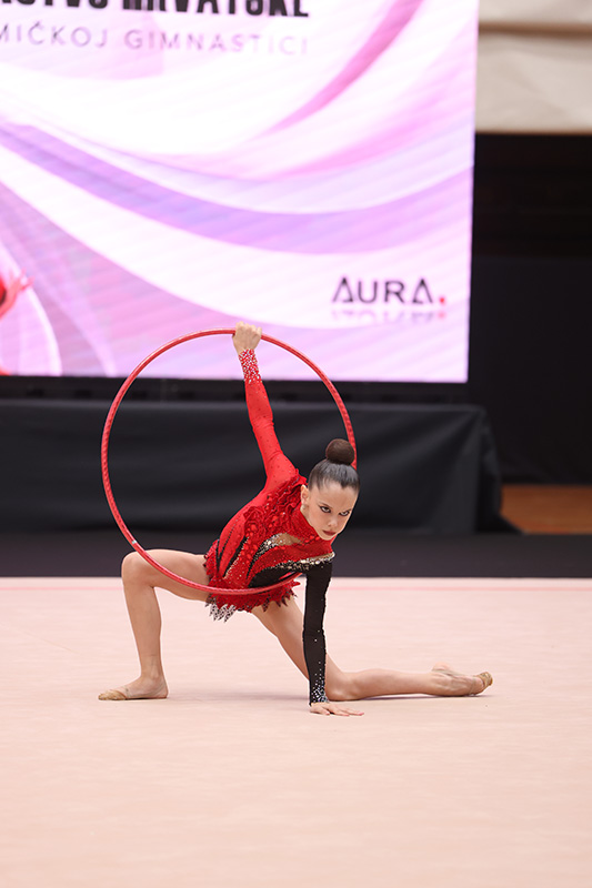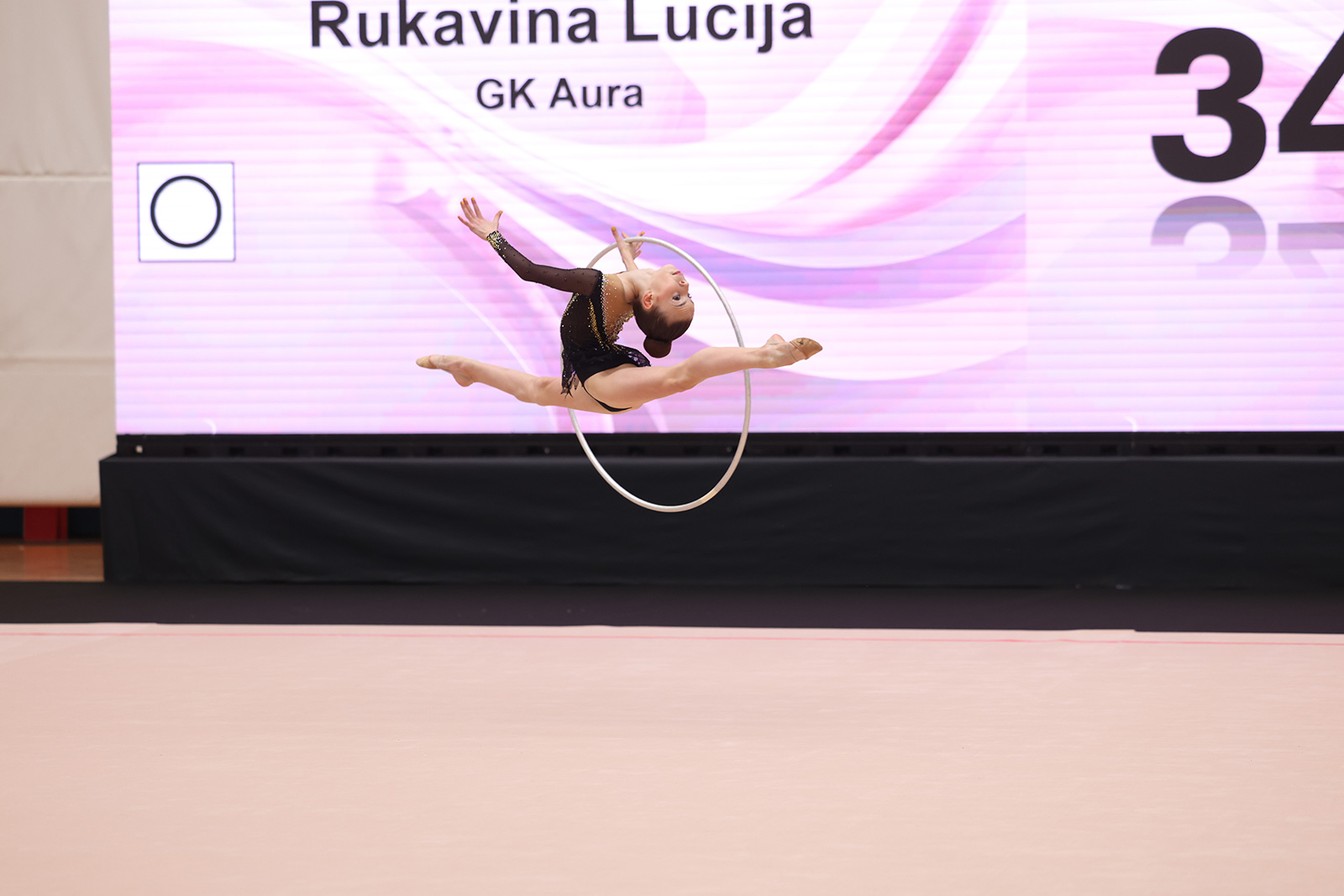 Ritmičarke Aure drže prva tri mjesta u mlađejuniorskoj konkurenciji – Hana Gradečak je na vrhu nakon dva odrađena rekvizita (42.350), a slijede je Elena Majcen (41.300) i Lucija Rukavina (38.250). Kadetkinja Lede Lara Mahmoud Elhaty Hosny vodi sa 41.100, druga je njezina klupska kolegica Ana Hojski (40.800), a treća Tena Šandl iz GK Aura sa 38.350. Kod mlađih kadetkinja najbolja danas bila je Tia Mahmoud Elhaty Hosny (KRG Leda) sa 37.950, druga je Leoni Premužić (36.200), a treća još jedna ritmičarka GK Vindija, Lota Lukač (34.050).